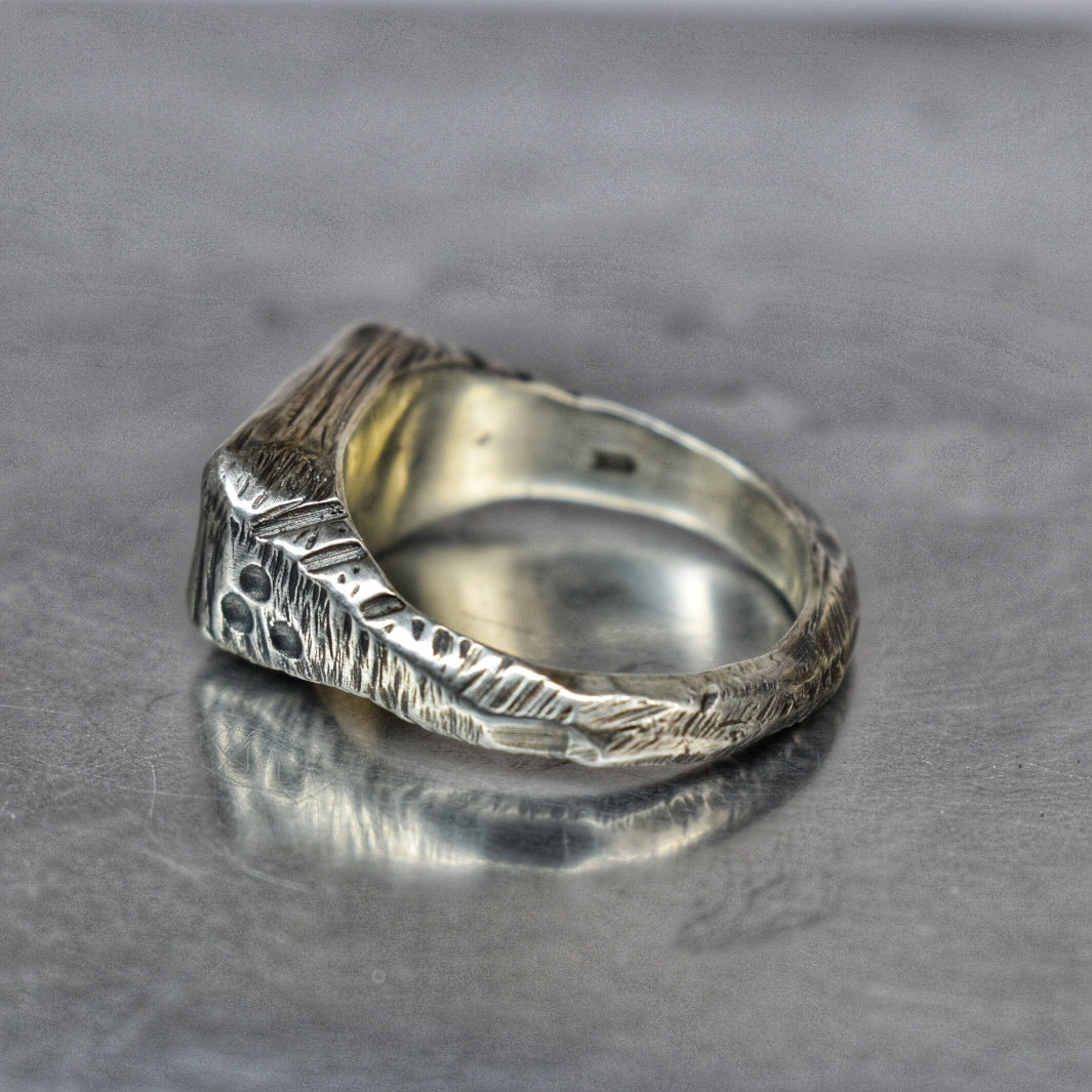 A large emerald-cut rhodolite garnet sits side ways in this ancient style sterling silver ring, my trademark carvings applied to the surface of the silver, creating an interesting contrast, with a nod to ancient style signet rings found buried underground for centuries. The sterling silver has been carefully treated with a patina to suit the aged look.