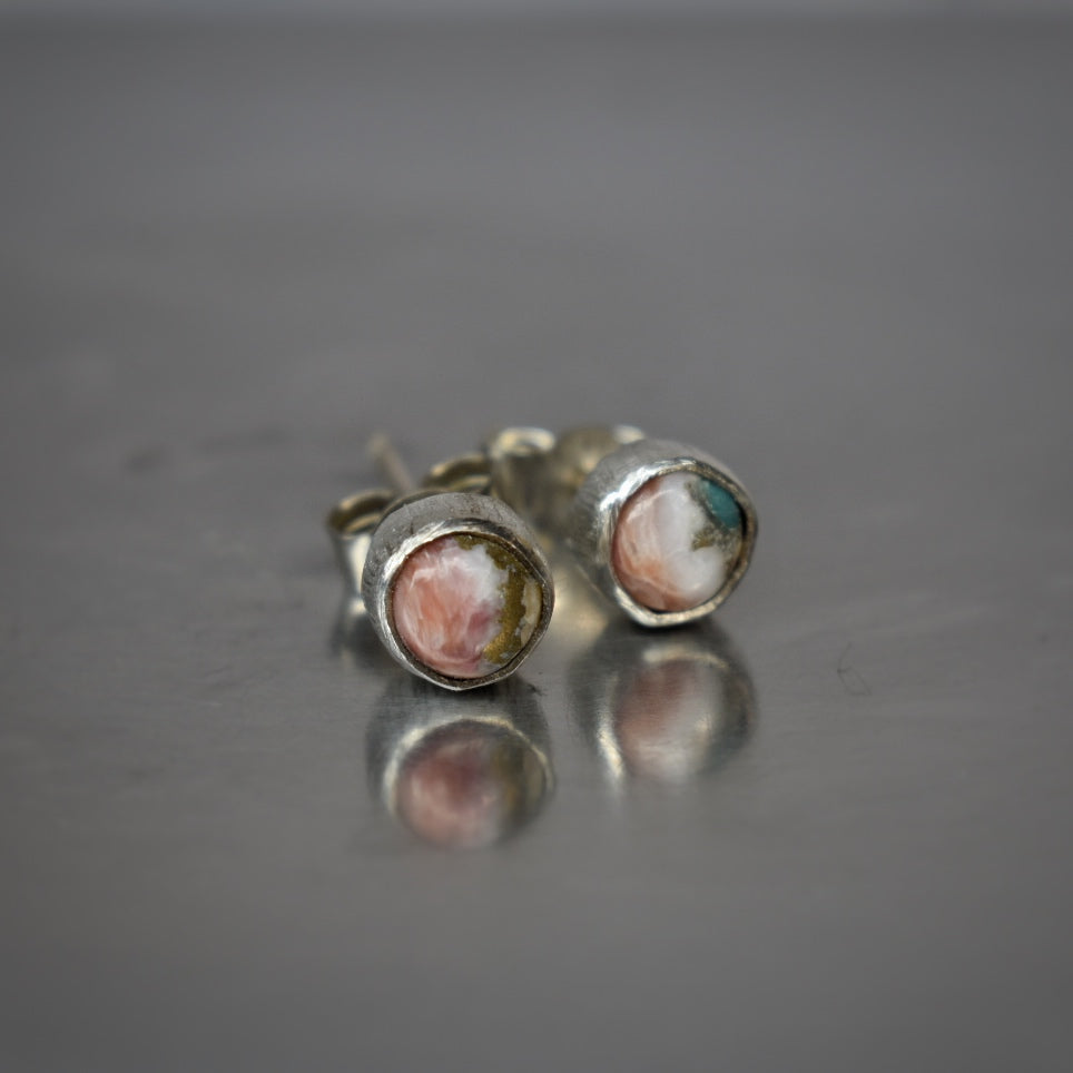 Mottled copper-turquoise with earthy cream and turquoise tones set in recycled sterling silver. Handmade settings with hand engraved edges and an antiqued satin finish. The studs measure 6mm across and have standard post fittings at the centre back with sterling scrolls.
